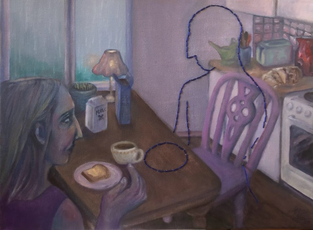 Water mixable oil paint and embroidery on canvas.
